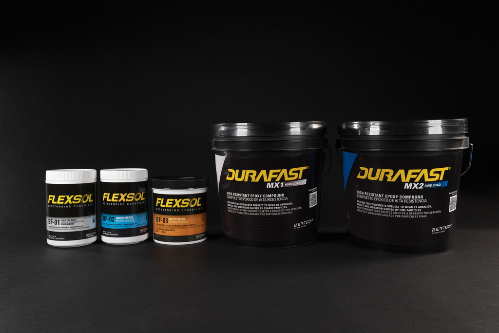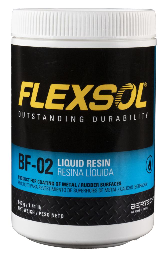 FLEXSOL BF-02: elastômero de uretano líquido com alta adesão ao metal e borracha para reparação de correias transportadoras, tambores, tanques, chutes, moinhos e peças expostas a ambientes ácidos, bem como a fabricação de peças moldadas e substituição de revestimentos de borracha diversos.