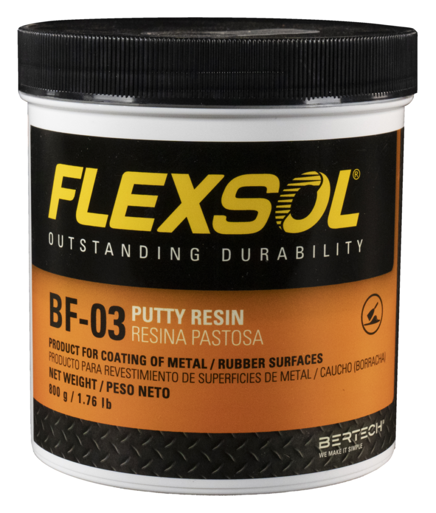 FLEXSOL BF-03: Elastômero de uretano líquido, de consistência pastosa para aplicação horizontal e vertical, com alta aderência à borracha e metal. Este revestimento permite a aplicação em superfícies verticais e horizontais, para a reparação simultânea de superfícies de metal e borracha.