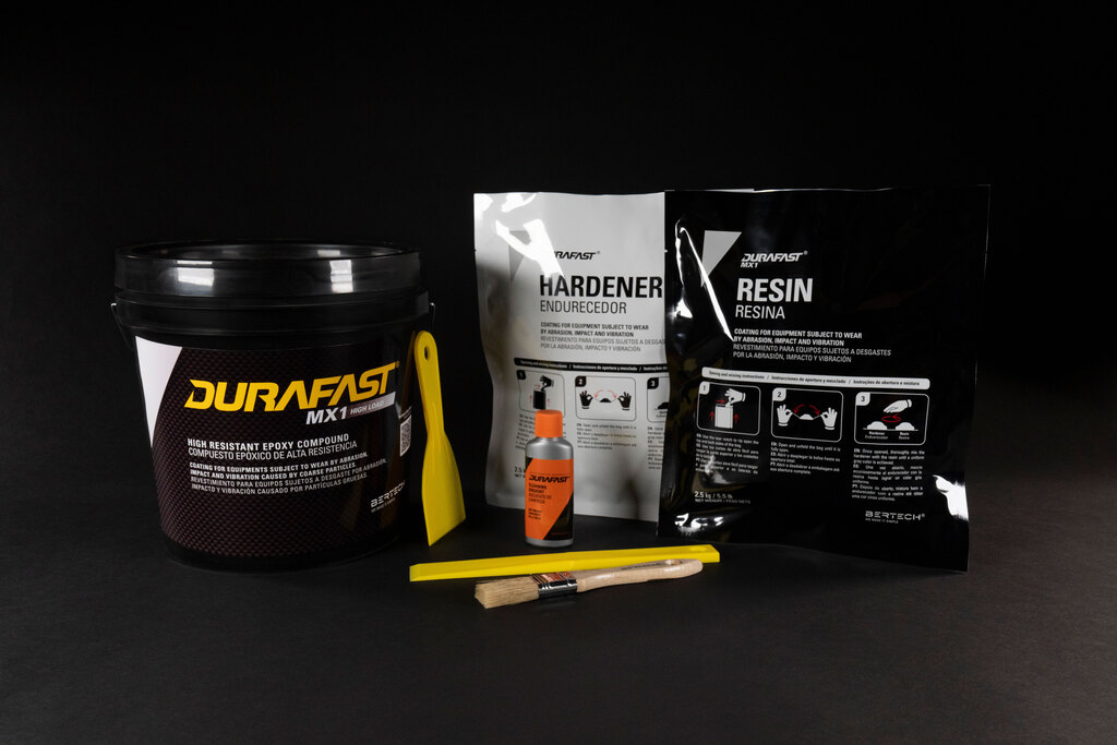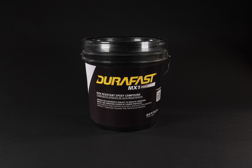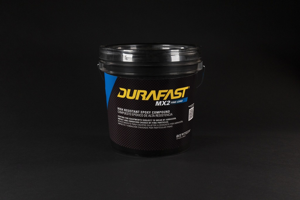 DURAFAST MX2: contém esferas de óxido de alumínio de 1 mm que permitem reparar com um acabamento suave pequenos furos em superfícies metálicas e equipamentos industriais expostos ao desgaste por abrasão, impacto e vibração causado por partículas finas.